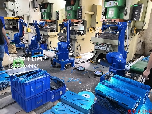 是工业机器人中的在冲床上的应用,由上料机构,冲床,机器人,下料机构等组成. 如下图为奥松冲压键盘的冲床机器人