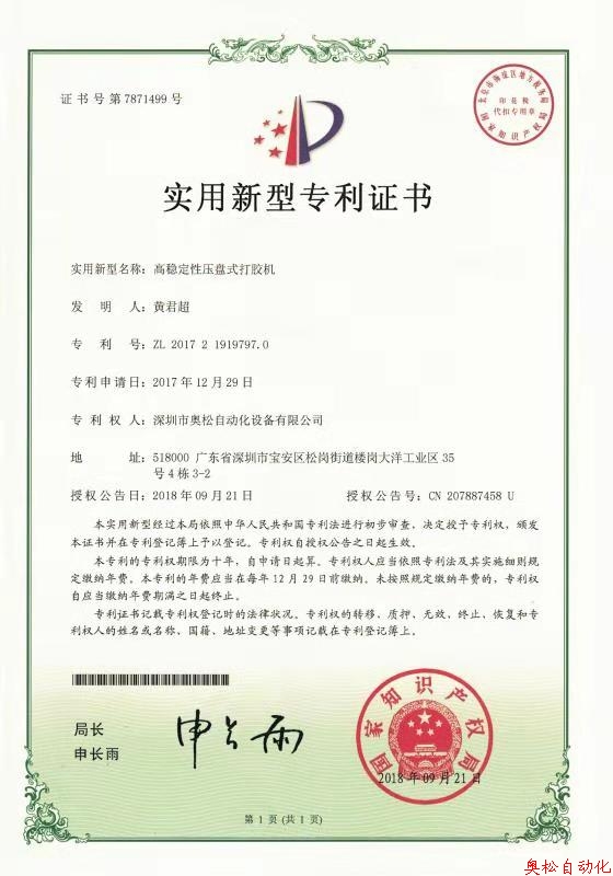 灌胶机 是我司生产的主要产品,这些年一直生产半自动灌胶机、全自动灌胶机.近年来,公司加大开发力度,投入人力物力研发出一款名叫:高稳定性的压盘式打胶机.申请了专利,专利号:ZL201721919797.0