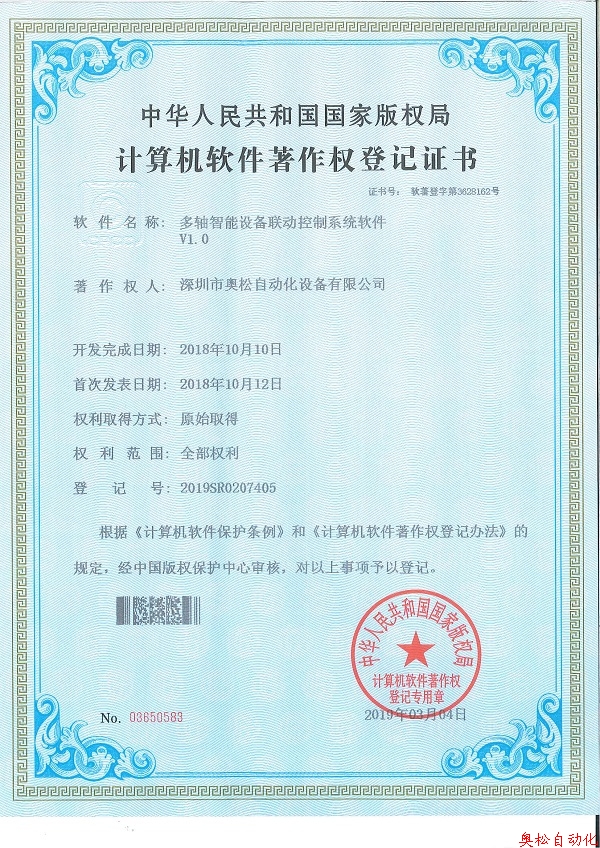 奥松荣获多轴智能点胶机设备联动控制软件专利