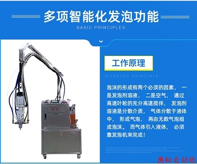 发泡机特点:1. 本发泡机由不锈钢外壳、发泡混合枪头、AB料桶、注胶软件四大部分构成;